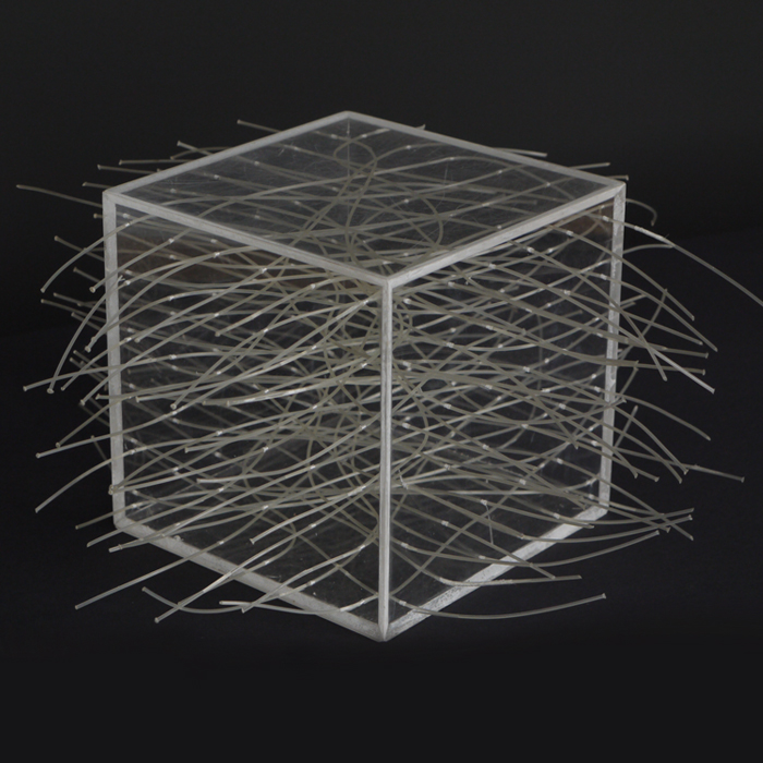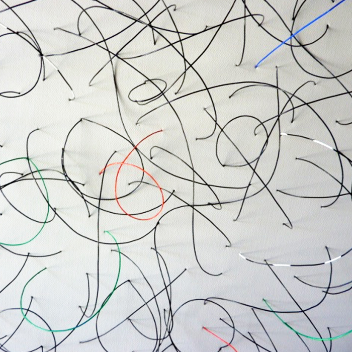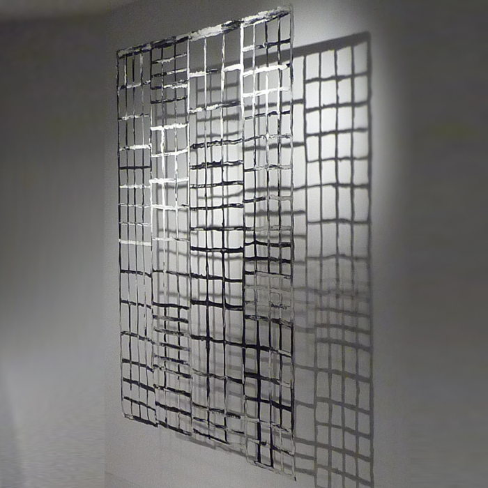 The two-dimensional qualities of drawing were there to be challenged. Why shouldn’t the lines lift off the surface and work with each other, and against each other? So my spatial drawings were conceived. The viewer is needed: the slightest movement, even of the eyes alone, results in changing imagery, and it is never ending. Rules and parameters: lines are of certain proscribed lengths, are curved or kinked or stuttered, are placed in grids or not. Two-dimensional lines drawn or splashed onto the support combine and play with the three-dimensional ones.